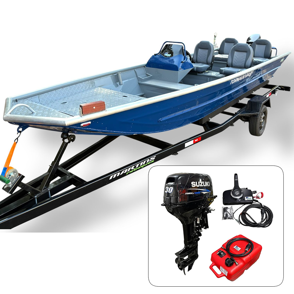 Barco Tornado 550 BASS SD com Suzuki 30 HP 2T partida elétrica e comando original preço PJ + Carreta Rod. + Acessórios de navegação montados - Pronta Entrega