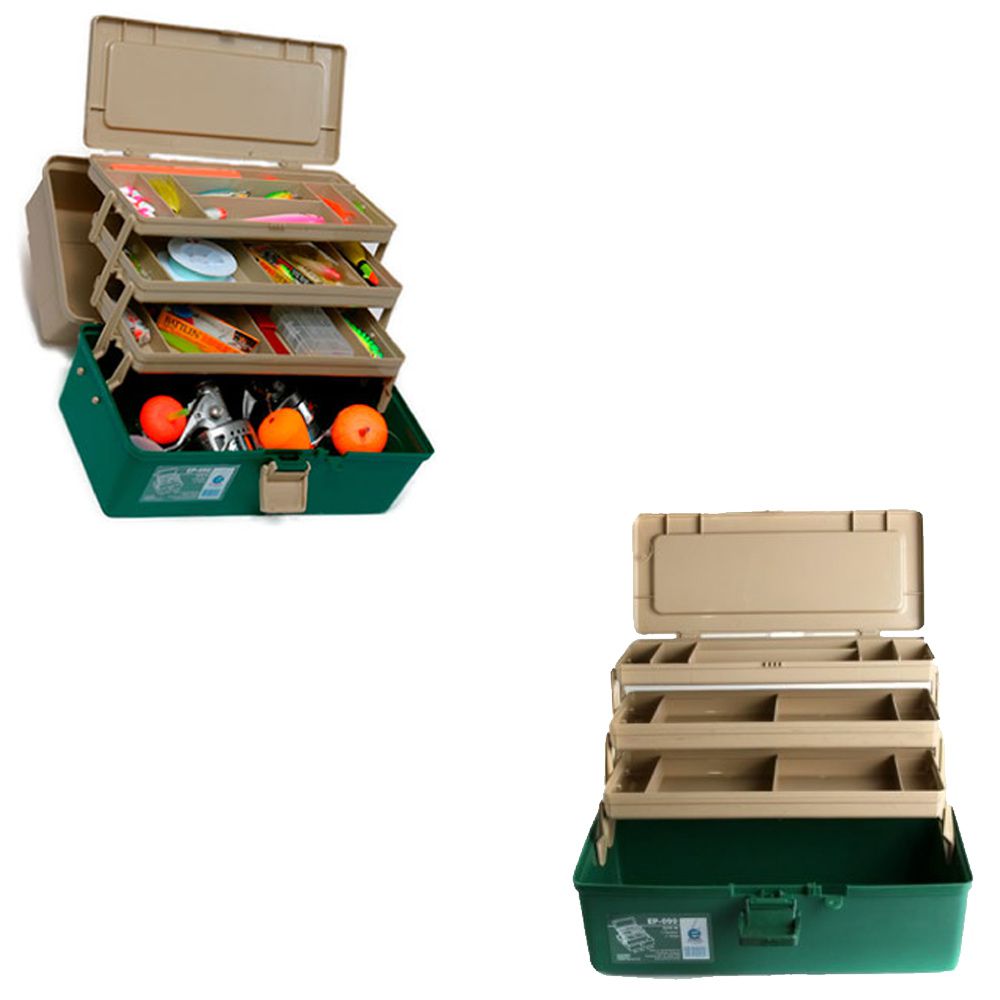 Estojo para pesca com 3 bandejas articuladas e tampa superior, totalizando 15 divisões.