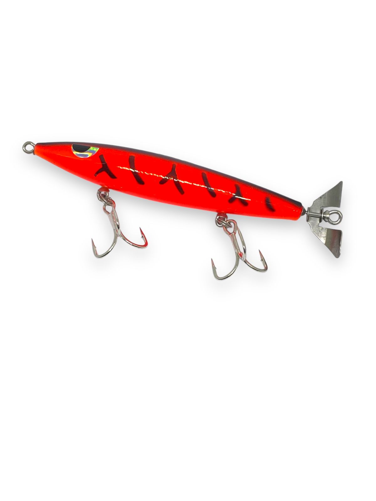 A Devassa é fabricada em madeira leve e resistente, possui pitões e hélice em aço inox reforçado, além de garatéias 6X na cor vermelha.