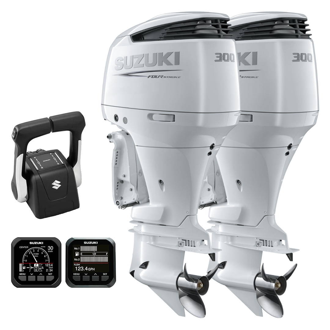 A parelha de motores Suzuki DF300 HP V6 EFI 25” na cor branca entrega impressionantes 600 HP de potência total, combinando a robustez de um bloco V6 de alta cilindrada com a sofisticação do acabamento branco premium.